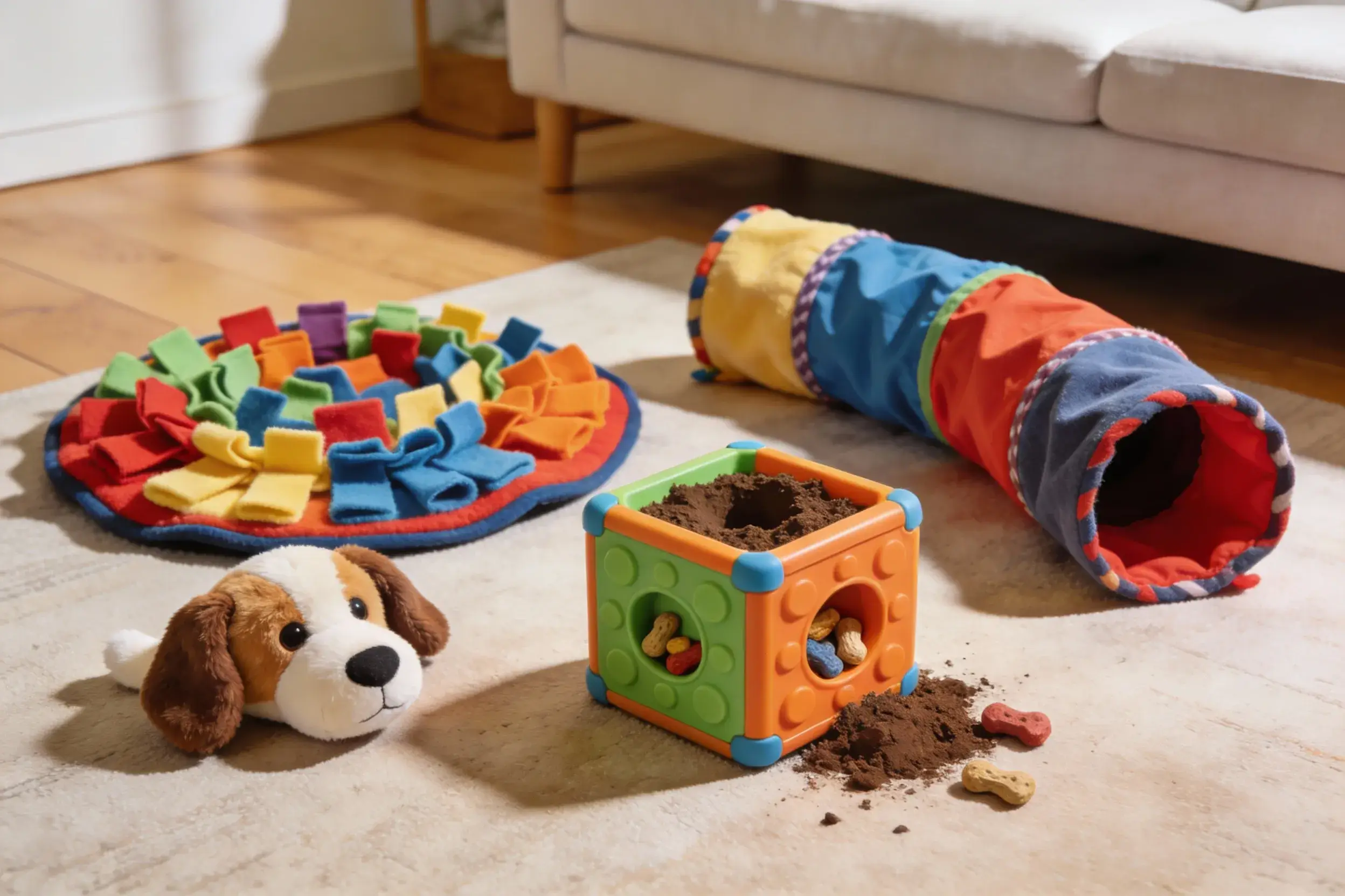 - For anxious or bored dogs: rotate toys, switch up hiding spots, and incorporate calming scents